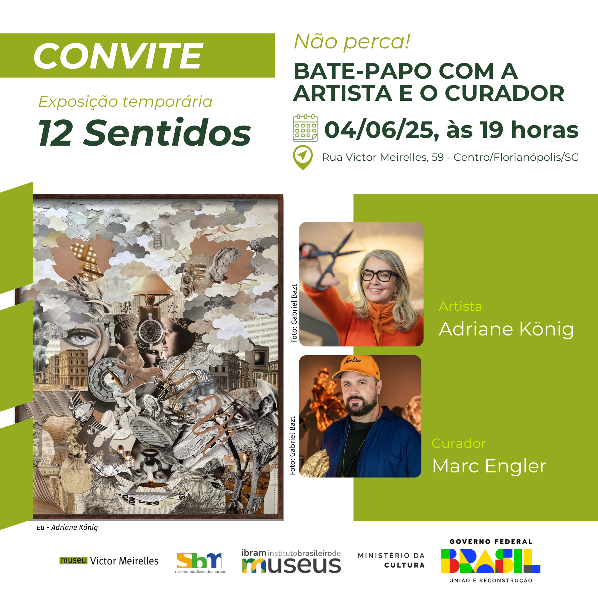 O Museu Victor Meirelles (Ibram/MinC) promove, na próxima quarta-feira, 4 de junho de 2025, às 19h, um bate-papo com a artista visual Adriane König e o curador Marc Engler, responsáveis pela exposição 12 Sentidos. Com entrada gratuita, o encontro será uma oportunidade para o público tirar dúvidas e conhecer melhor o processo de criação das colagens manuais que deram origem às 12 obras e instalações em cartaz, que propõem uma experiência sensorial e de autoconhecimento por meio da arte. Elas representam os sentidos humanos e exploram a visão antroposófica dos estudos do filósofo e educador Rudolf Steiner, também permitindo que os visitantes expressem sua criatividade no espaço interativo.